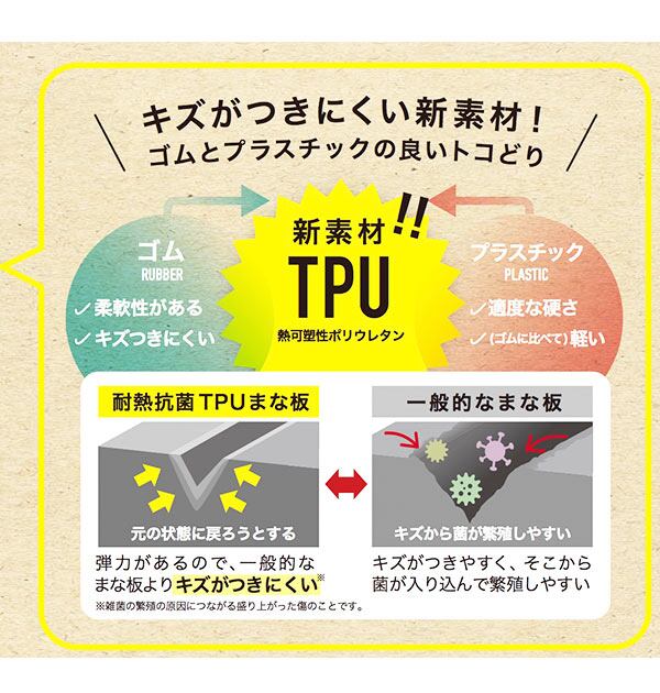 ゴムのような弾力と柔軟性、プラスチックのような適度な硬さ。シリコンほどやわらかくなく、プラスチックのようなカチカチではない扱いやすさから、スマホの保護カバーなどでおなじみのTPU素材で、まったく新しいまな板ができました!一般的なまな板よりはキズが付きにくくなっています。また、抗菌剤入りなので清潔にお使いいただくこともできて安心です。また、まな板の周囲にフチがあるので、汁気の多い食材を切っても調理台など周りにこぼれにくく、周囲を汚しにくいです。このまな板は裏面もエンボス加工が施され、両面使用が可能です。食材に合わせて表と裏を使い分けられて便利♪耐熱温度100度のまな板だから、熱湯消毒も可能です。また、食器洗浄機も対応していますので、お手入れだって簡単です。