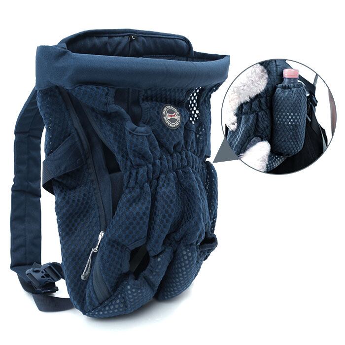 ・バッグ左側サイドにはペットの出入り時に便利なファスナー、右側サイドには水分補給用のウォーターボトルを収納できるメッシュポケットを配置。