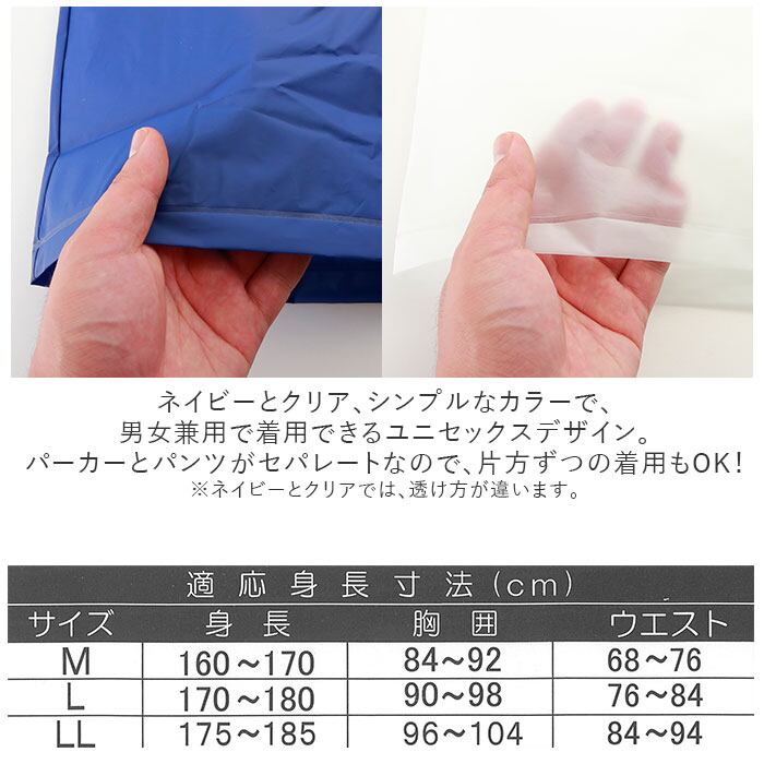 ・ネイビーとクリア、シンプルなカラーで、男女兼用で着用できるユニセックスデザイン。パーカーとパンツがセパレートなので、片方ずつの着用もOK!