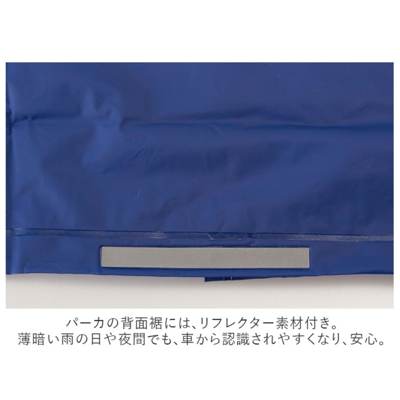 ・パーカの背面裾には、リフレクター素材付き。薄暗い雨の日や夜間でも、背後からすれ違う車から認識されやすくなり、安心。