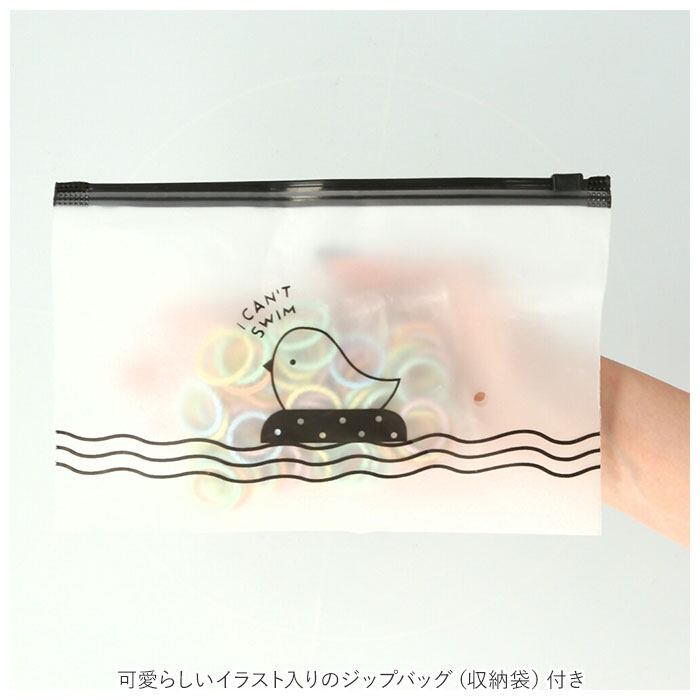 ・可愛らしいイラスト入りのジップバッグ(収納袋)付き。