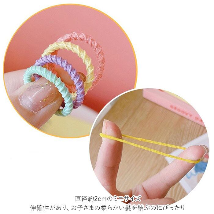 ・直径約2cmのミニサイズ。伸縮性があり、お子さまの柔らかい髪を結ぶのにぴったり。