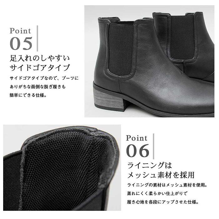 ・シャープなシルエットに合わせ、シャフト(筒)部分は両サイドゴア仕様。細身のパンツを被せた時も、裾がもたつかずすっきり!脱ぎ履きもラクチン。