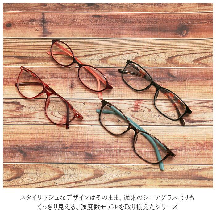 ・スタイリッシュなデザインはそのまま、従来のシニアグラスよりもくっきり見える、強度数モデルを取り揃えたシリーズ。