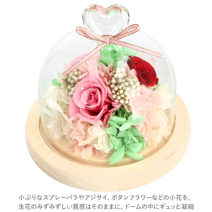 ・小ぶりなスプレーバラやアジサイ、ボタンフラワーなどの小花を、生花のみずみずしい質感はそのままに、ドームの中にギュッと凝縮。