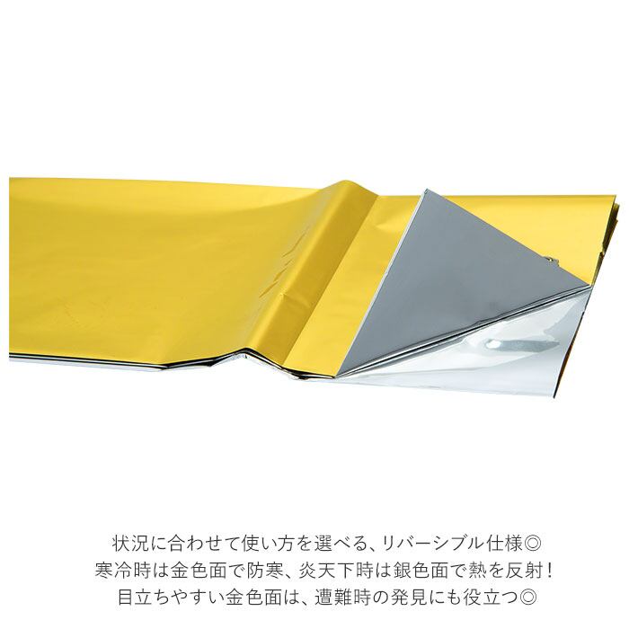 ・状況に合わせて使い方を選べる、リバーシブル仕様◎寒冷時は金色面で防寒、炎天下時は銀色面で熱を反射!目立ちやすい金色面は、遭難時の発見にも役立つ◎