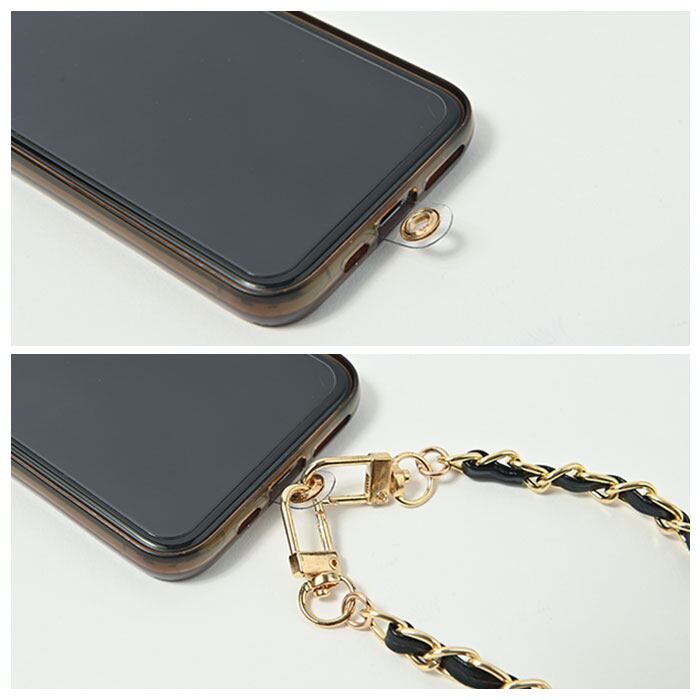 ・付属の透明ストラップホルダーをお手持ちのケースにセットし、穴部分にストラップを取り付ければOK。