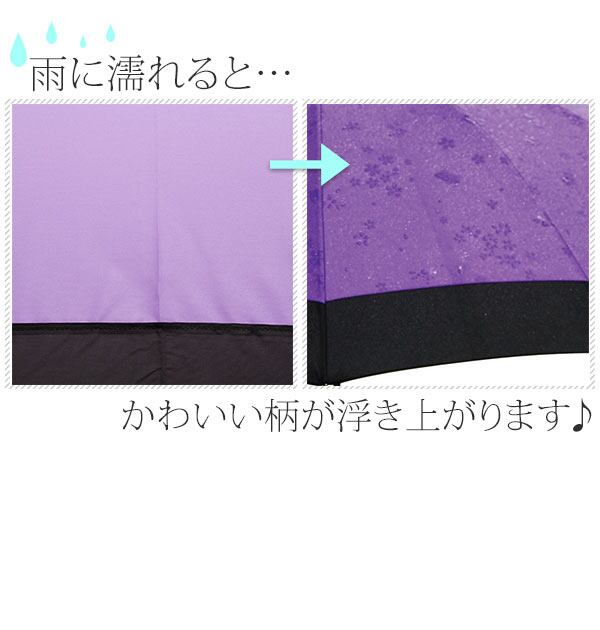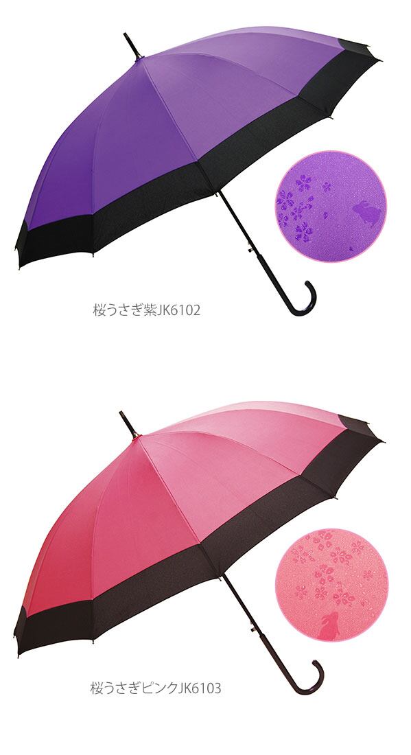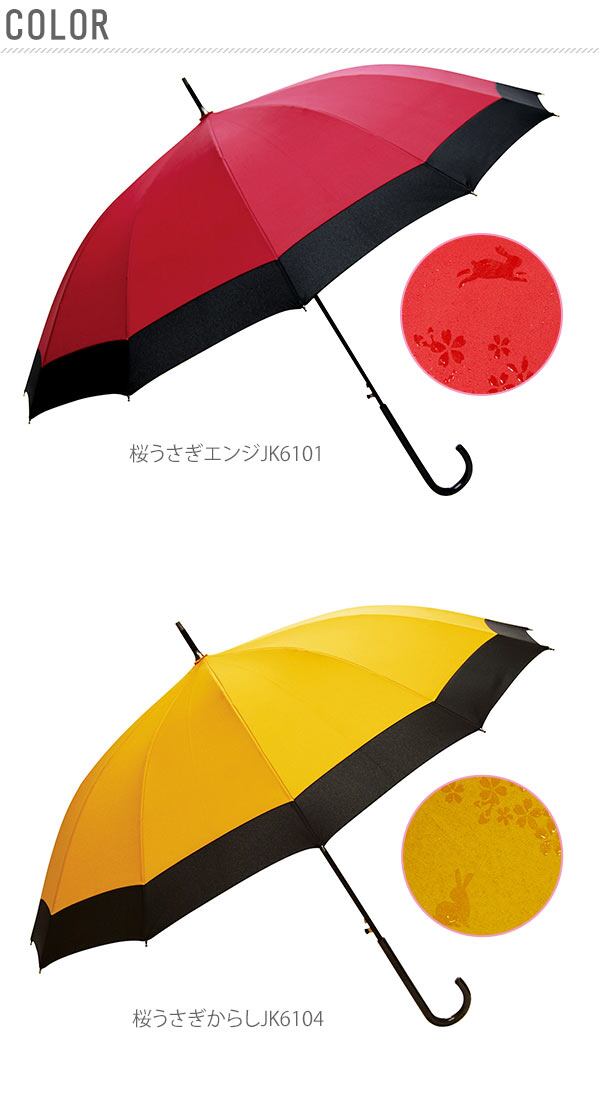 12本骨蛇の目風の桜うさぎ柄がかわいい、ジャンプ式の和傘です。傘が濡れると桜とうさぎの模様が浮き出ます。