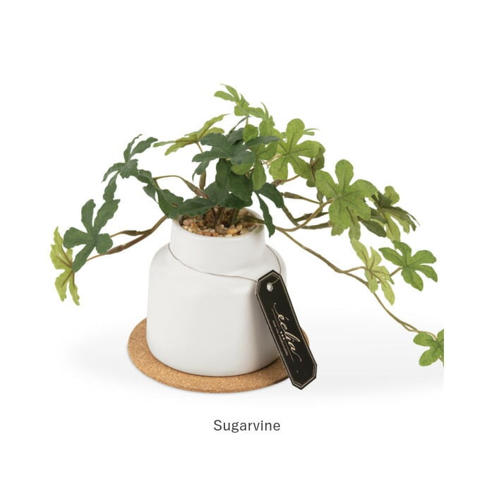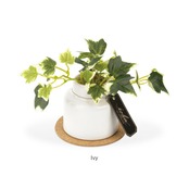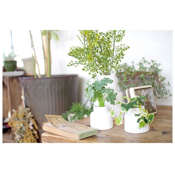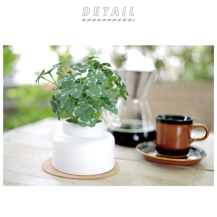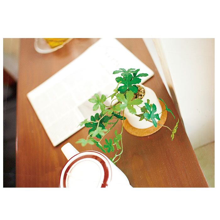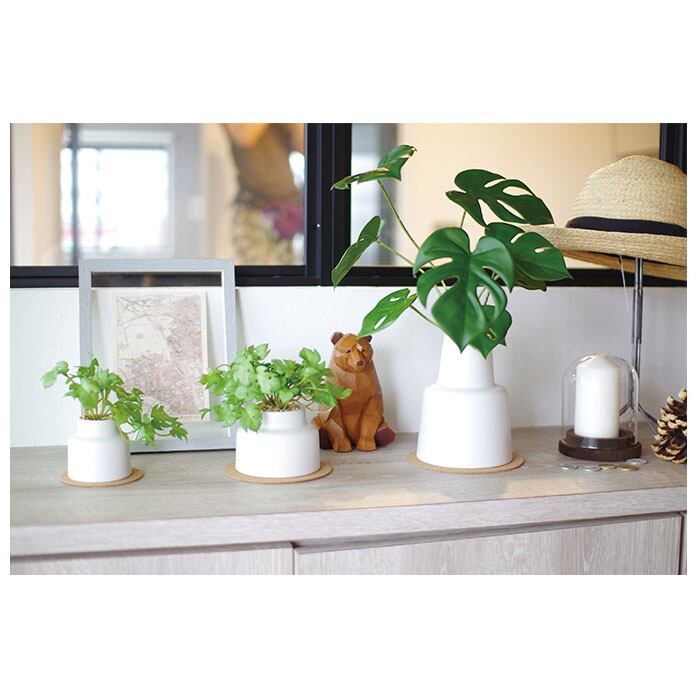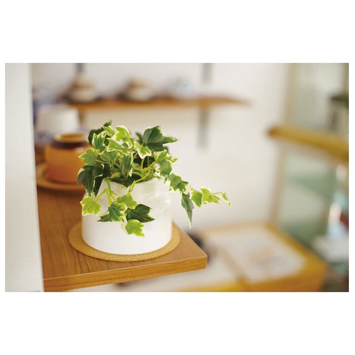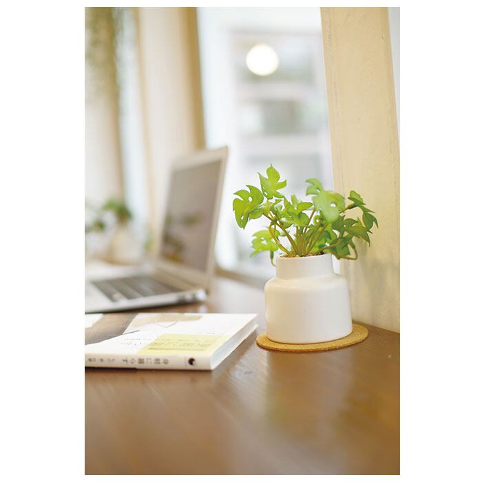 ・観葉植物として人気の高いアイビーやミニモンステラを、清潔感のあるホワイトのポットにIN!コルクのコースターと一緒に飾れば、お部屋が明るくナチュラルな雰囲気に。