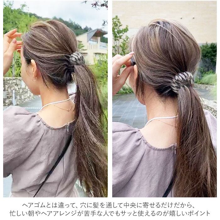 ・ヘアゴムとは違って、穴に髪を通して中央に寄せるだけだから、忙しい朝やヘアアレンジが苦手な人でもサッと使えるのが嬉しいポイント。
