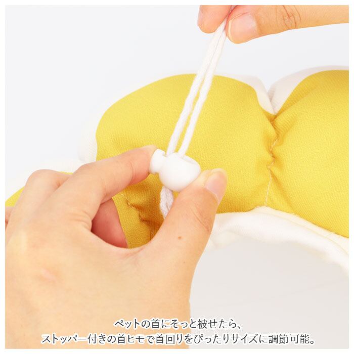 ・ペットの首にそっと被せたら、ストッパー付きの首ヒモで首回りをぴったりサイズに調節可能。