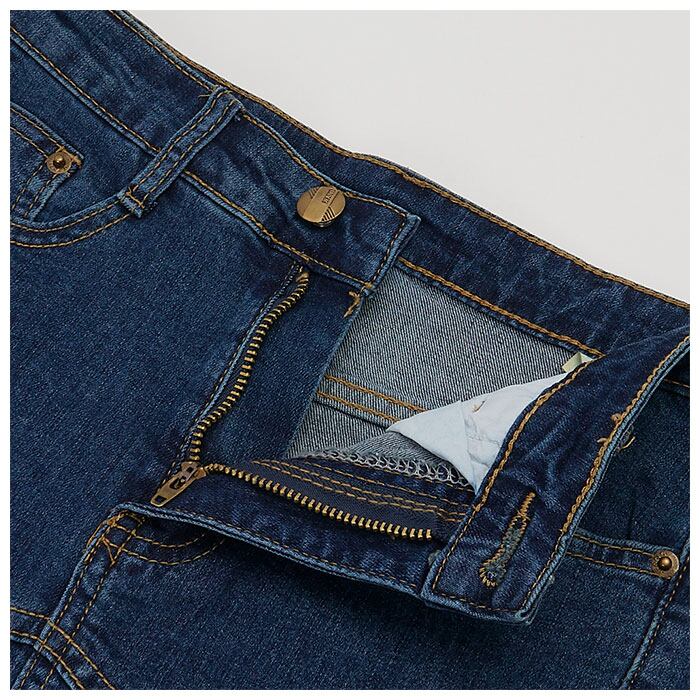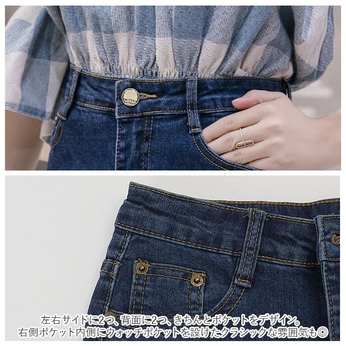 ・コットンデニム生地にポリウレタンを配合することで程よくストレッチを効かせ、スレンダーに見えるのに快適な着心地。