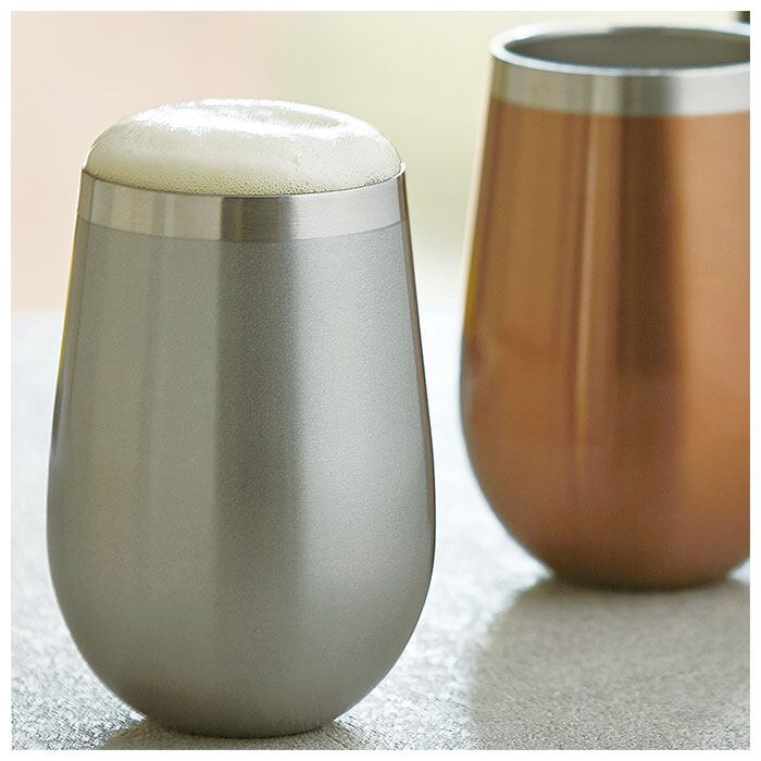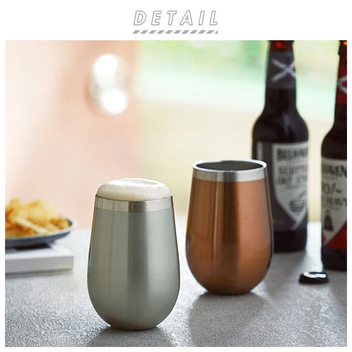 ・本体内側と外側が真空断熱されたステンレス二重構造タイプ。熱い飲み物を入れてタンブラーを持っても表面が熱くなく、冷たい飲み物を注いだ時に結露がでにくいのがポイント。ホットコーヒーも冷たいビールも飲み頃を温度を保って、美味しさキープ!