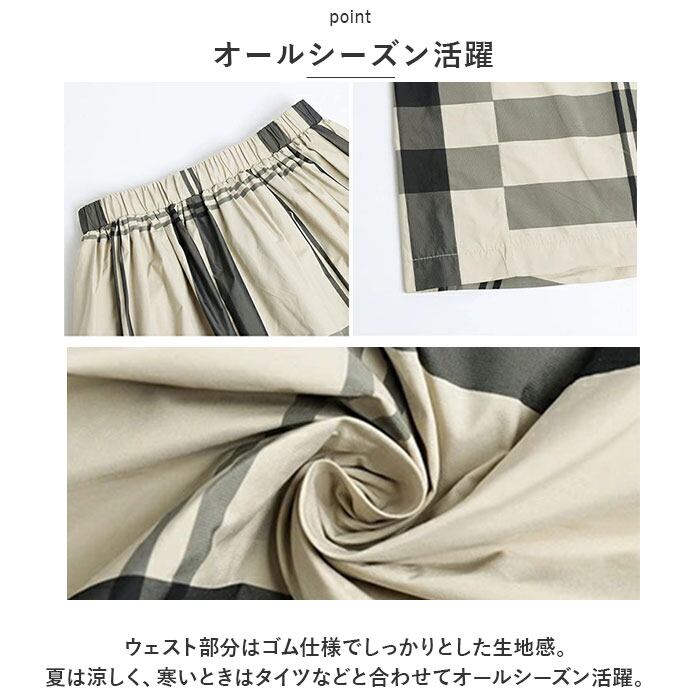 ・ウェスト部分はゴム仕様でしっかりとした生地感。夏は涼しく、寒いときはタイツなどと合わせてオールシーズン活躍。