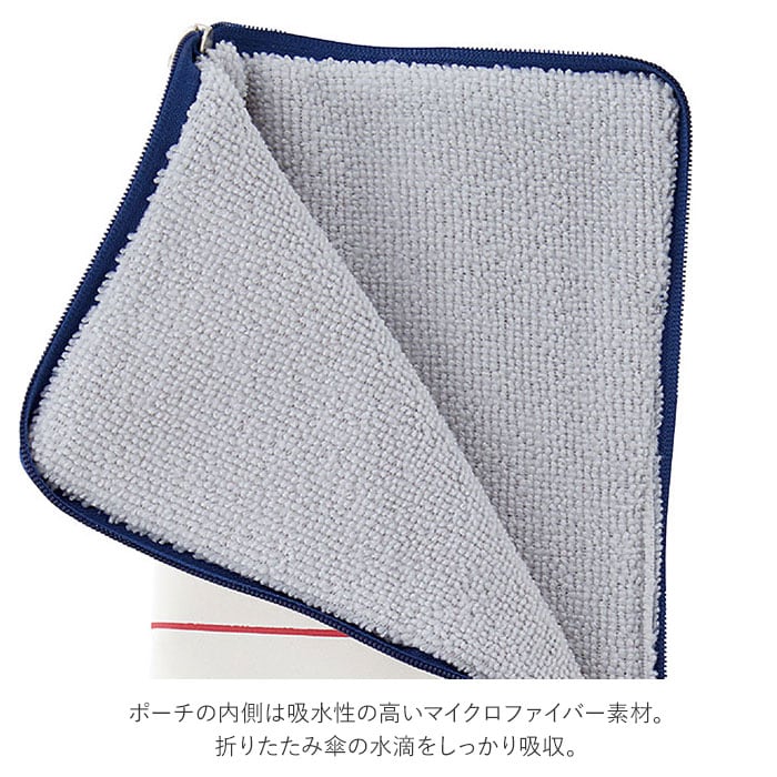 ・ポーチの内側は吸水性の高いマイクロファイバー素材。折りたたみ傘の水滴をしっかり吸収。