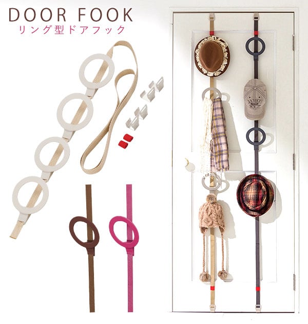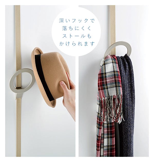 ドアのスペースを有効に使える、帽子用ドアフックです。工具いらずでドアにベルトをかけるだけで、帽子やマフラーなどがかけられるフックを付けることができます。ベルトはワンタッチで固定できるタイプで、ロックを解除すればスムーズにフックの位置を変更できます。帽子やストールなどがかけやすいリング型のフックです。