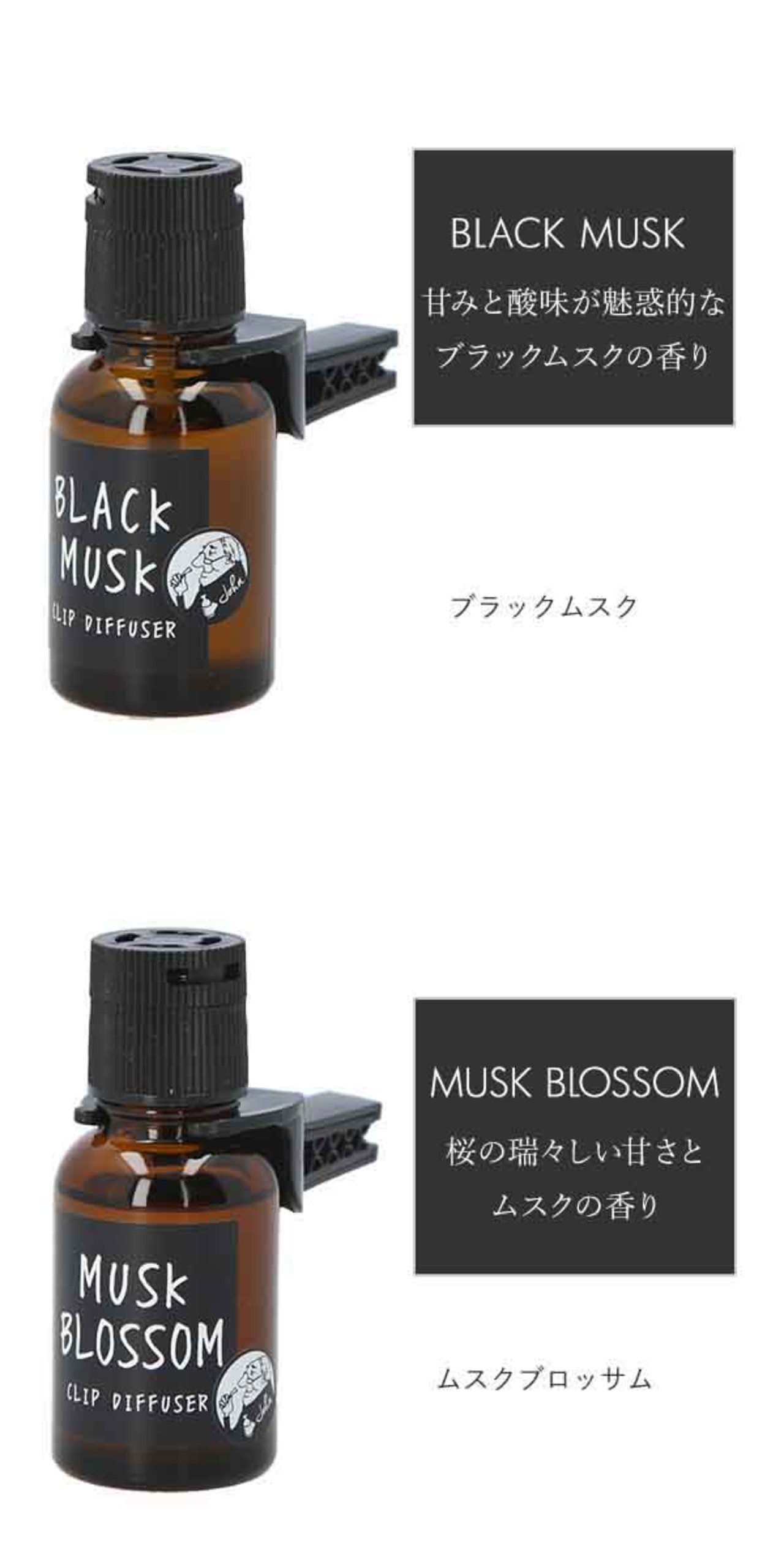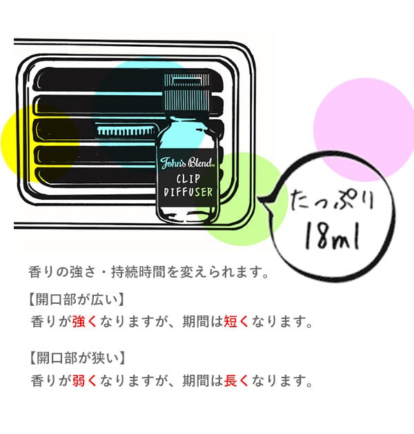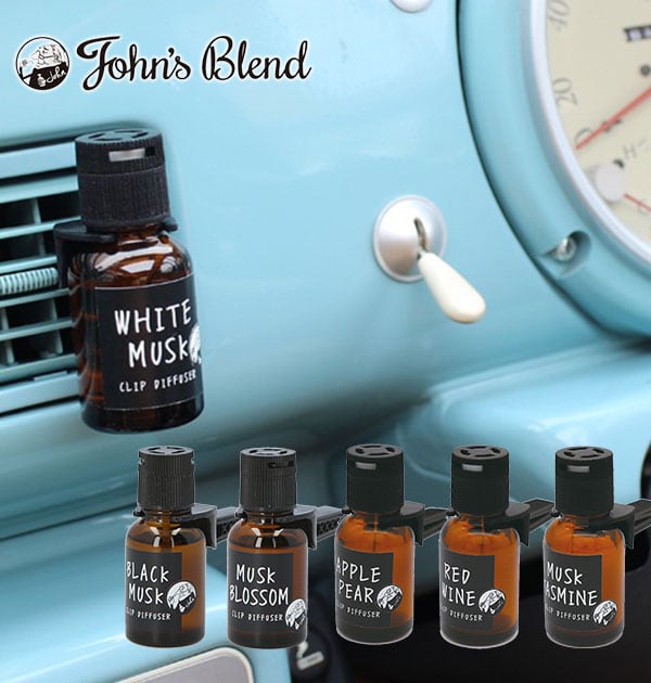 John’s Blendは、いい香りを身近に感じることで、日々の生活が豊かになってほしいという想いから生まれたブランドです。そんなJohn’sBlendより、車専用のフレグランス、クリップディフューザーが登場しました。取付けは簡単!瓶本体にクリップパーツを取り付け、吸水芯付きのフタを取り付けて、車内のエアコンルーバーに取り付けるだけ!カーフレグランス用に特別に調香された新鮮なアロマオイルのここちよい香りが、送風とともに車内いっぱいに広がります。