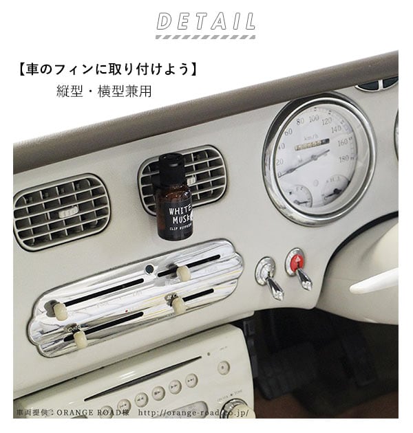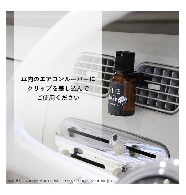 3.社内のエアコンルーバーにクリップを差し込んでご使用ください。送風とともに心地よい香りが広がります。