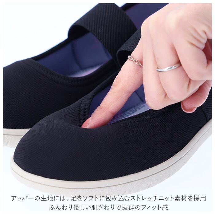 ・アッパーの生地には、足をソフトに包み込むストレッチニット素材を採用。ふんわり優しい肌ざわりで抜群のフィット感。