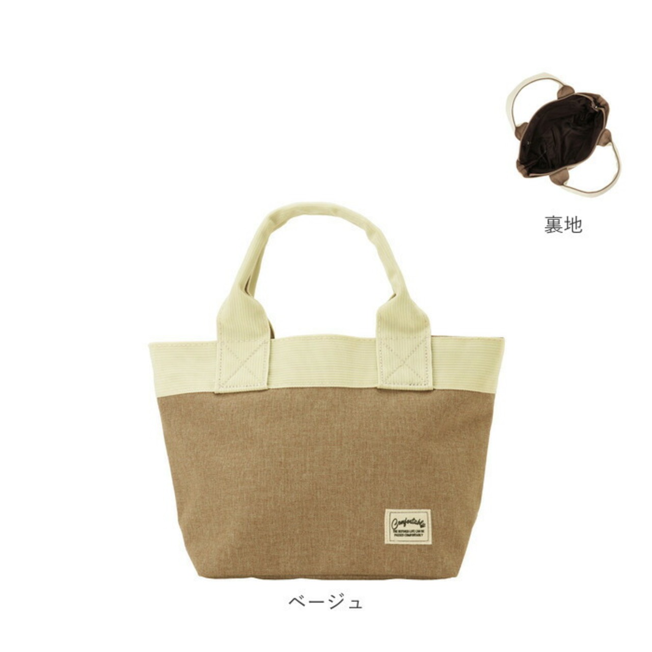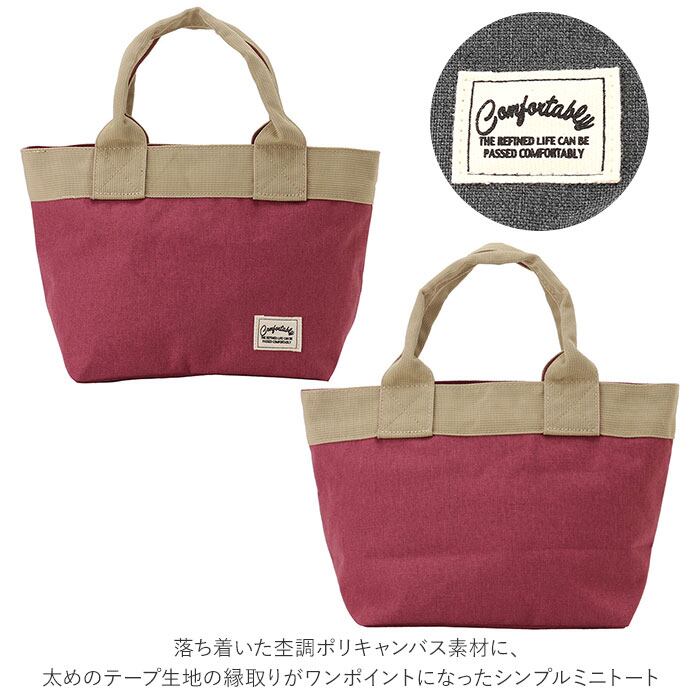・落ち着いた杢調ポリキャンバス素材に、太めのテープ生地の縁取りがワンポイントになったシンプルミニトート。
