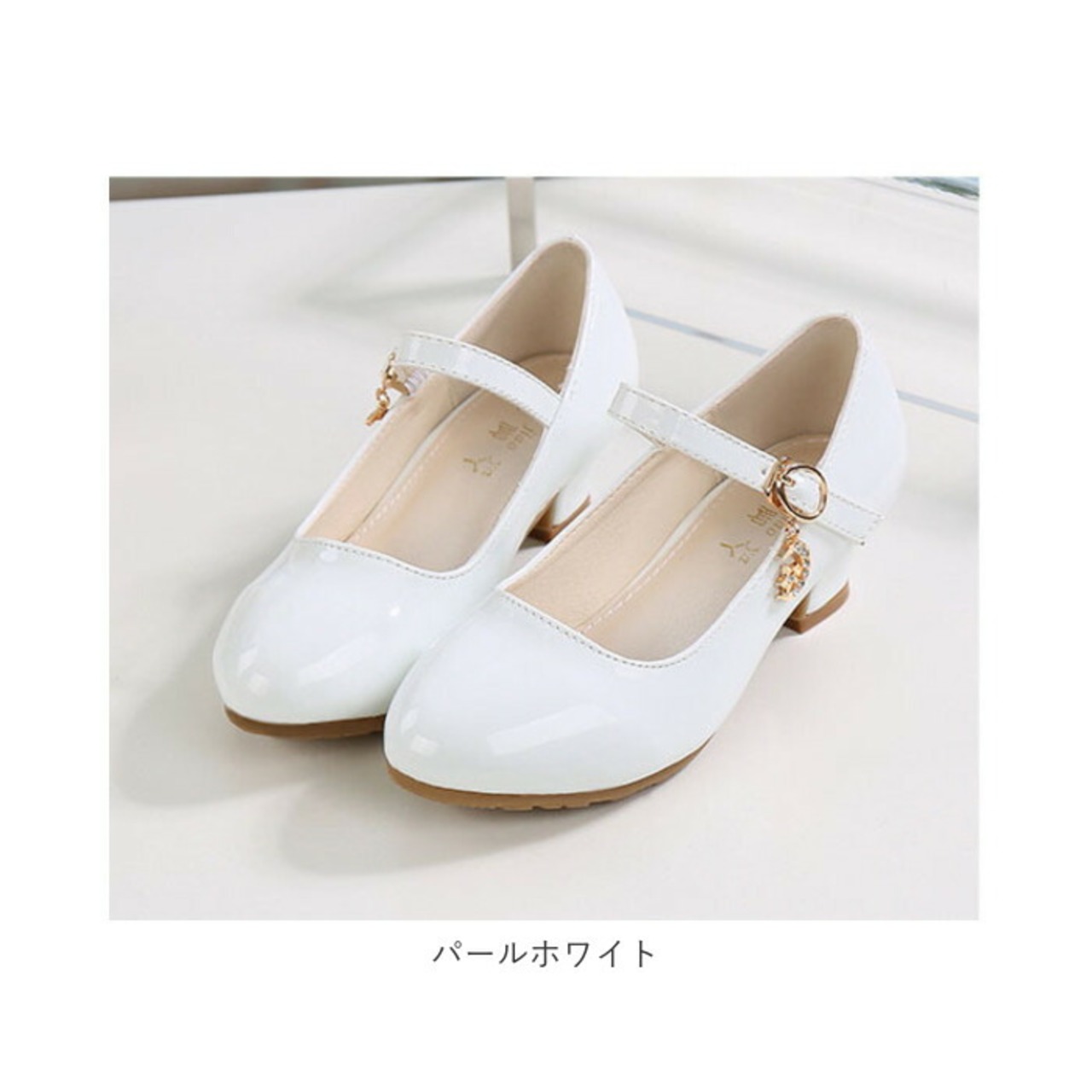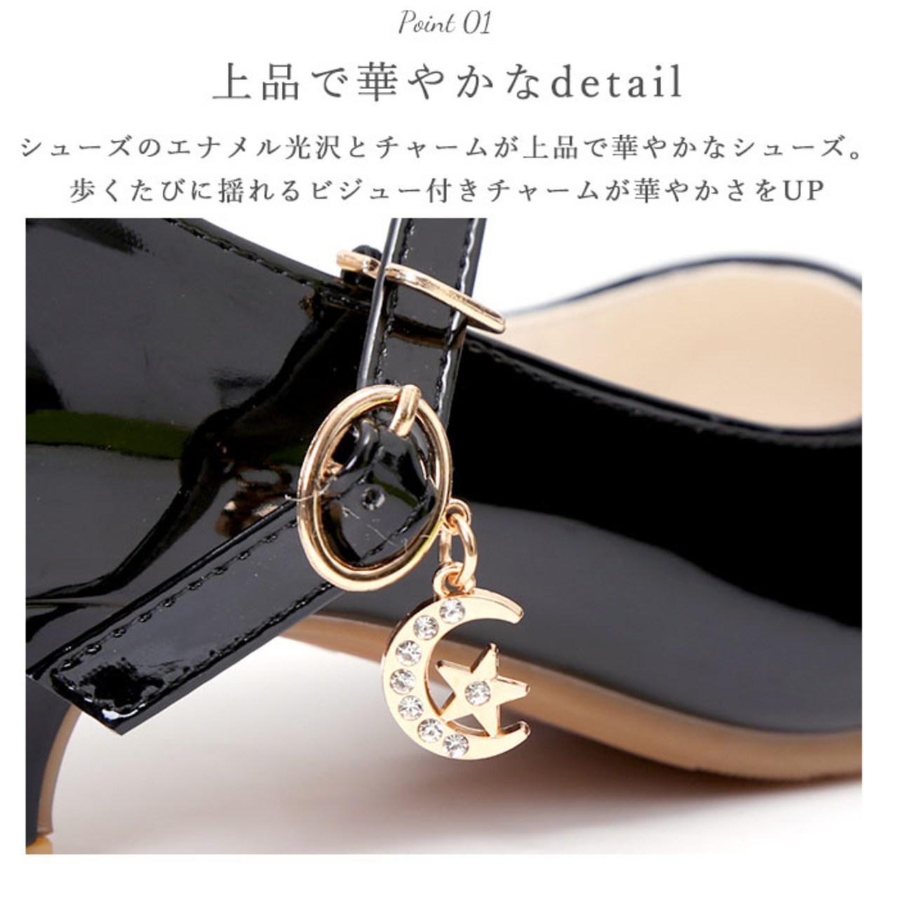 ・シューズのエナメル光沢とチャームが上品で華やかなシューズ。歩くたびに揺れるビジュー付きチャームが華やかさをUP。