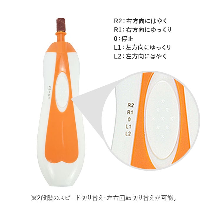 ・付け替え可能なアタッチメント6種類が付属。さらに、2段階のスピード切り替え機能に加え、左右どちらの手でも使いやすいよう、左右回転切り替えが可能。