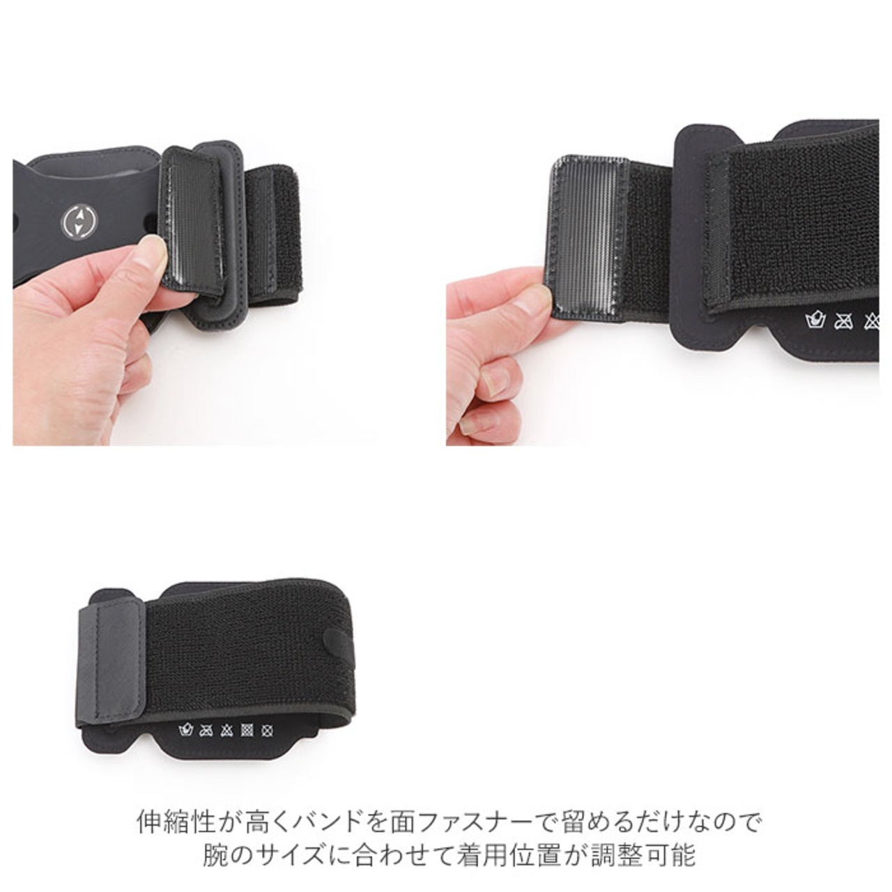 ・伸縮性が高くバンドを面ファスナーで留めるだけなので、腕のサイズに合わせて着用位置が調整可能。