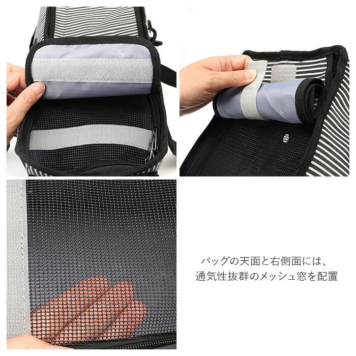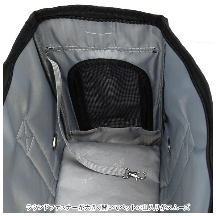 ・バッグの天面と右側面には、通気性抜群のメッシュ窓を配置。ラウンドファスナーが大きく開いてペットの出入りがスムーズ。