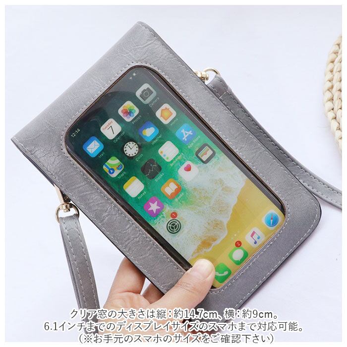 ・クリア窓の大きさは縦:約14.7cm、横:約9cm。6.1インチまでのディスプレイサイズのスマホまで対応可能。(※お手元のスマホのサイズをご確認下さい)