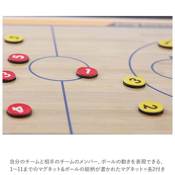 ・自分のチームと相手のチームのメンバー、ボールの動きを表現できる、1〜11までのマグネット&ボールの絵柄が書かれたマグネット×各2付き。