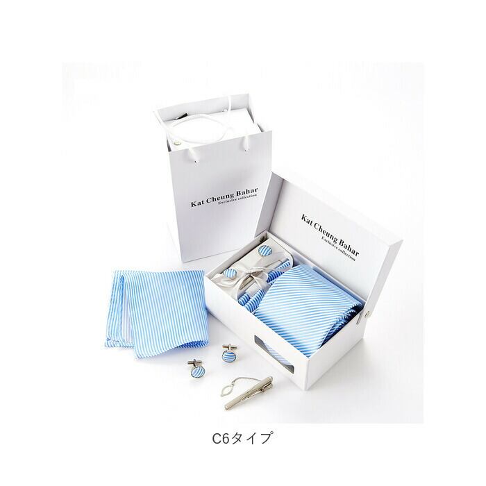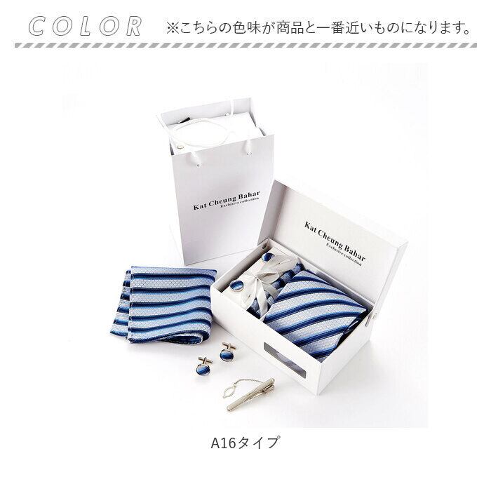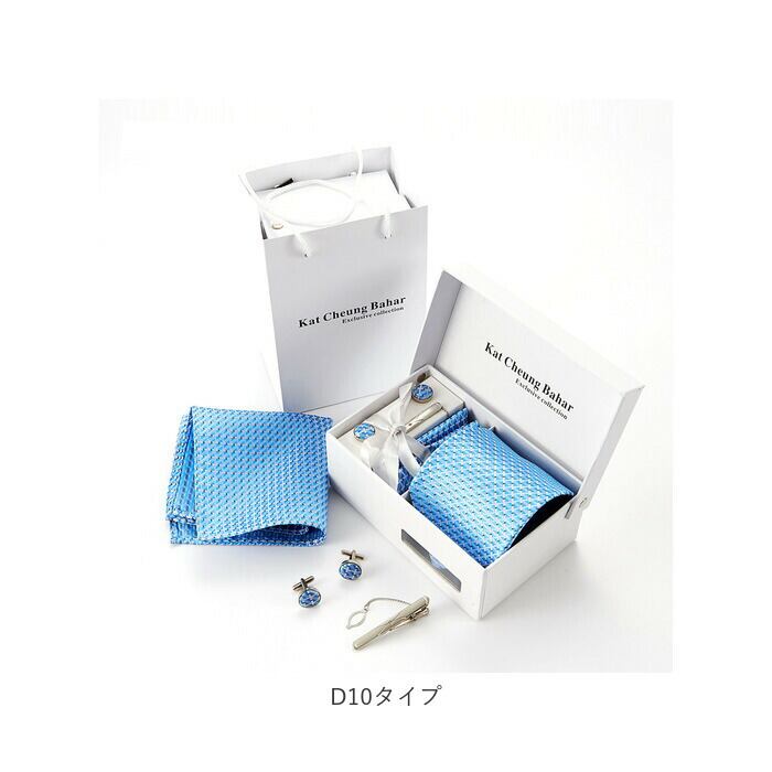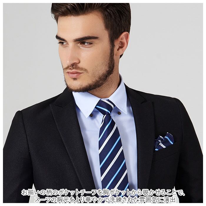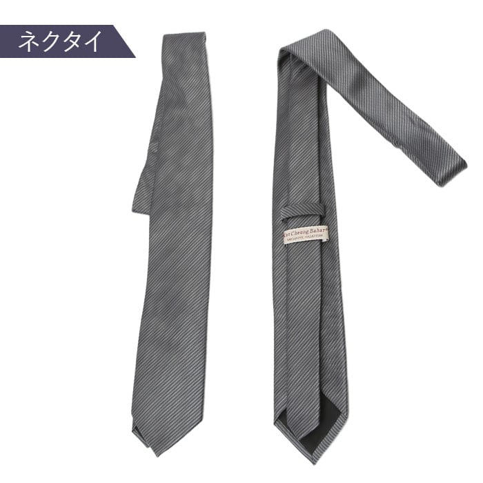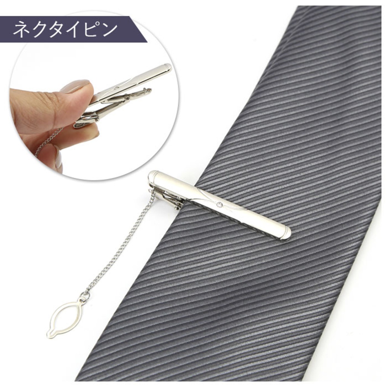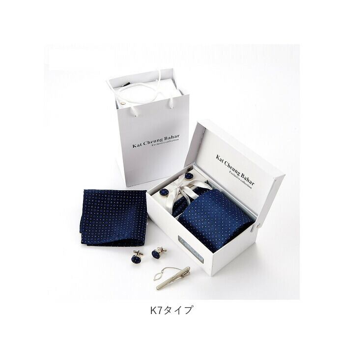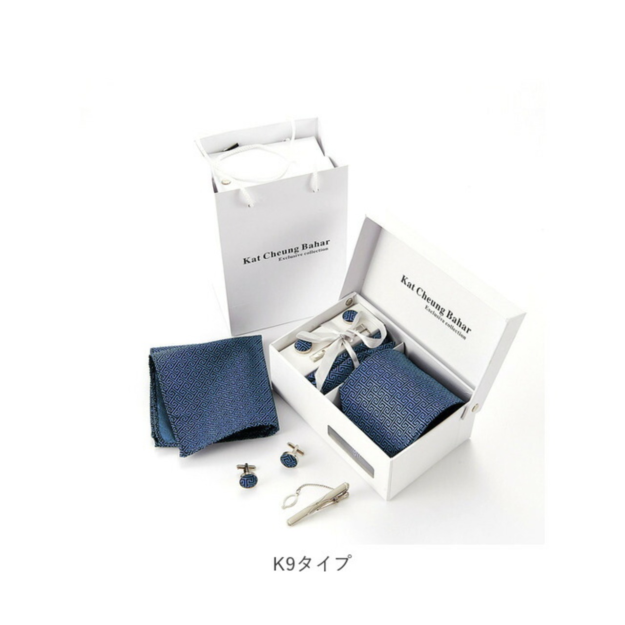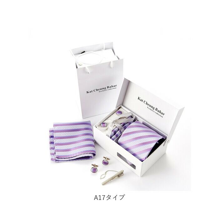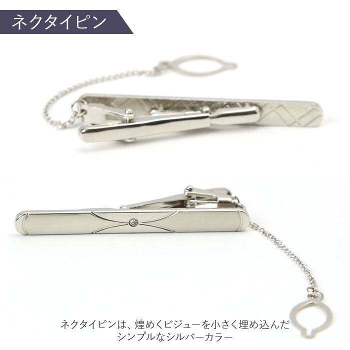 ・ネクタイ・ポケットチーフ・カフスボタン×2個、ネクタイピンを取り揃えた、豪華4点セット。