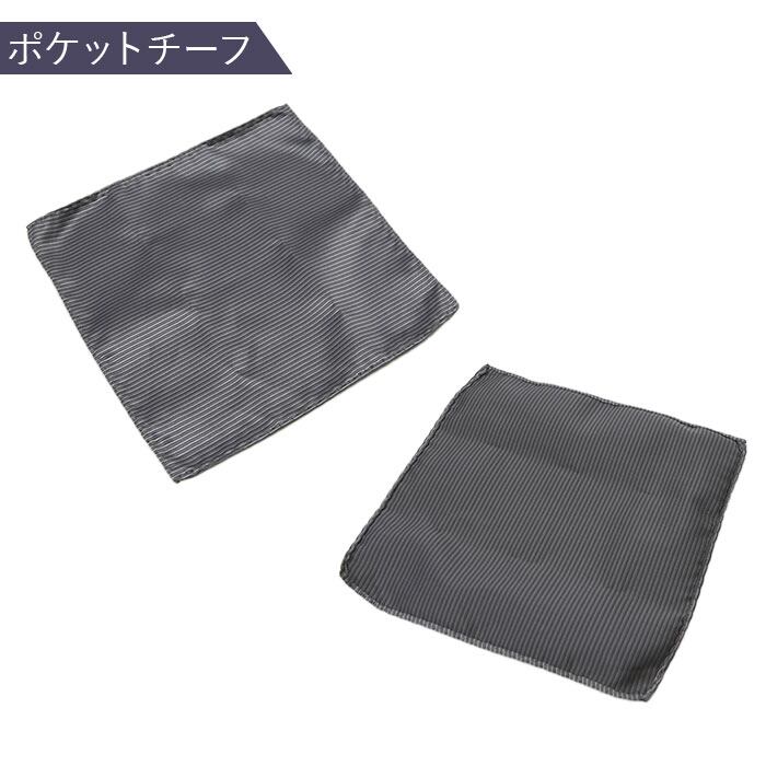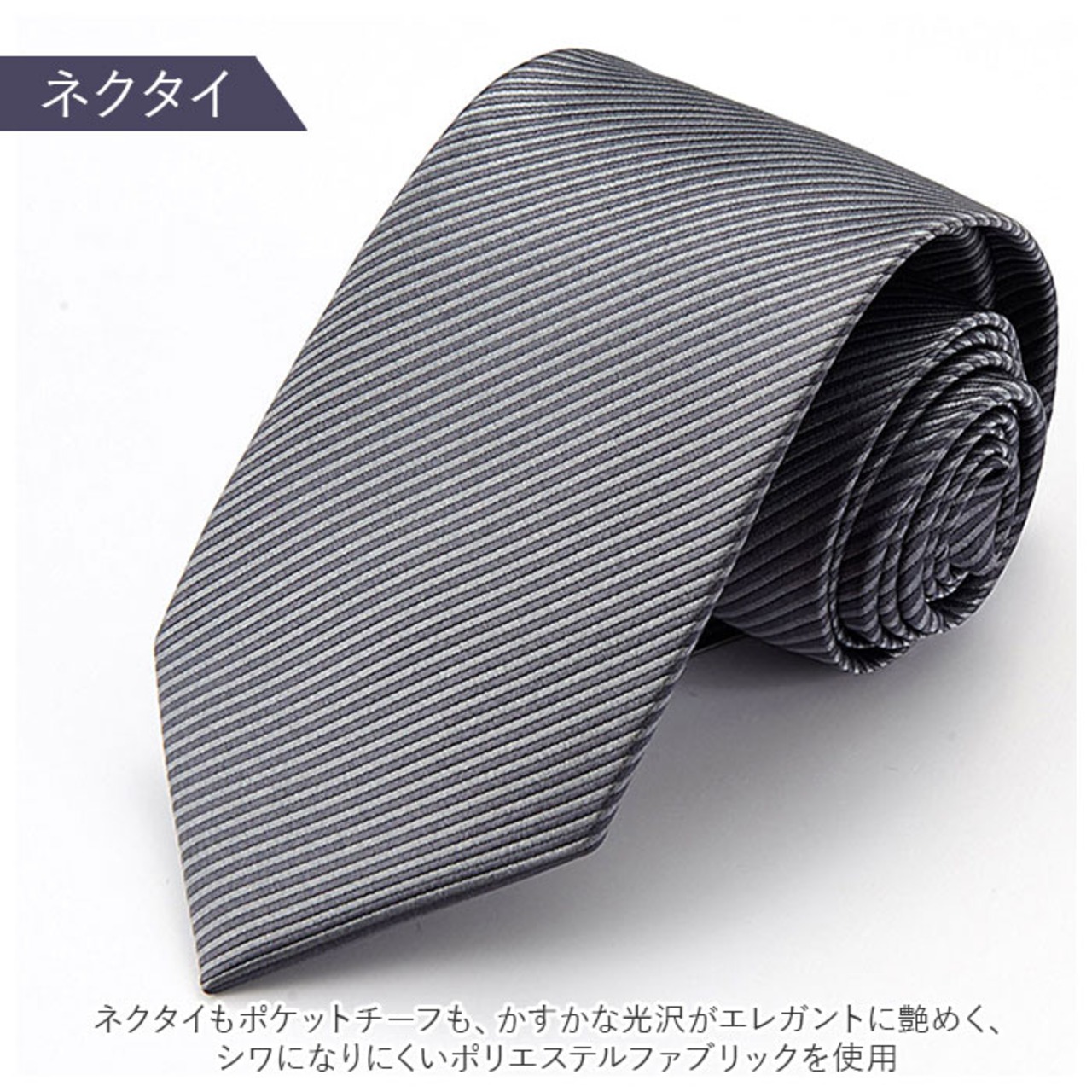 ・ネクタイもポケットチーフも、かすかな光沢がエレガントに艶めく、シワになりにくいポリエステルファブリックを使用。