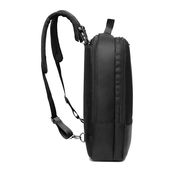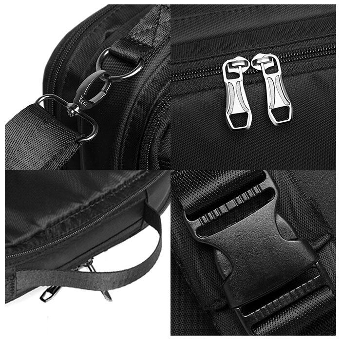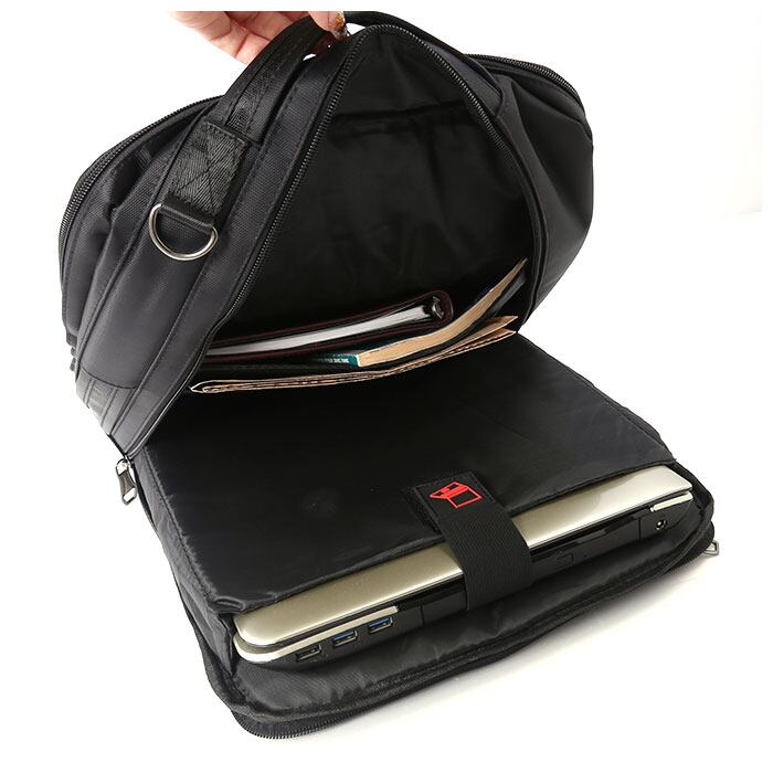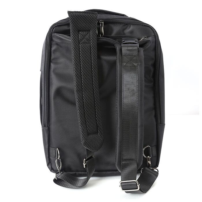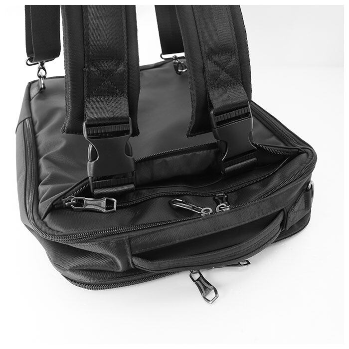 ・ショルダーベルトを背面のファスナーポケットに収納して横向きにすると、ブリーフケースとしても使える。