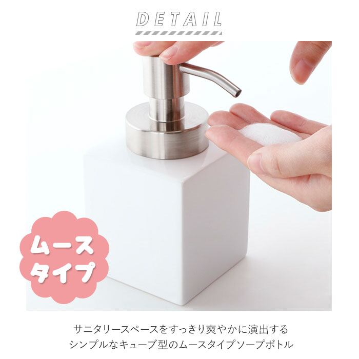 ・サニタリースペースをすっきり爽やかに演出する、シンプルなキューブ型のムースタイプソープボトル。
