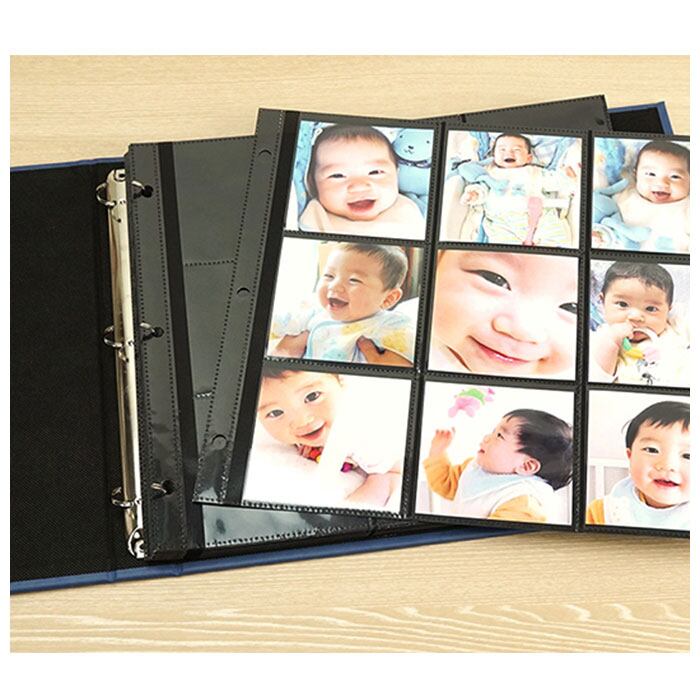 ・写真が映える黒色のポケット台紙は、89mm×89mmの写真を片面に9枚、両面に18枚収納することが可能♪