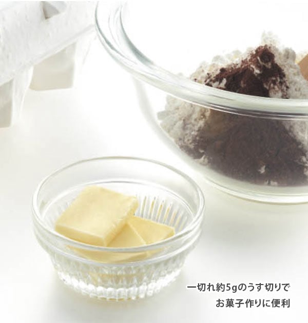 約5gごとにカットできるバターケース(200gサイズの場合)。いつもはきれいに扱えないバターを、あらかじめカットできて便利。パン、トーストに、またパンケーキなどにも、お料理に使う時にも丁度良いサイズにカット。
