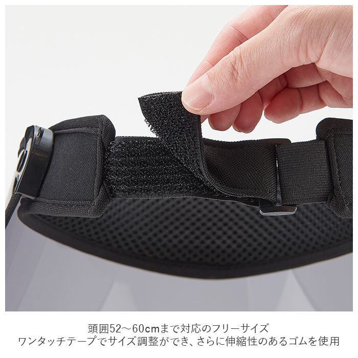 ・頭囲52cm〜60cmまで対応のフリーサイズ。ワンタッチテープでサイズ調整ができ、さらに伸縮性のあるゴムを使用。