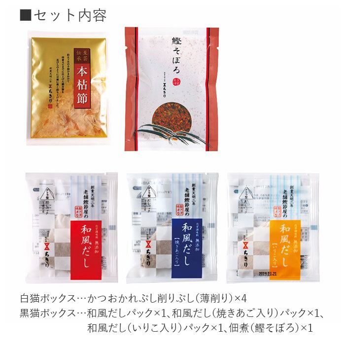 ・黒猫ボックス…和風だしパック×1、和風だし(焼きあご入り)パック×1、和風だし(いりこ入り)パック×1、佃煮(鰹そぼろ)×1