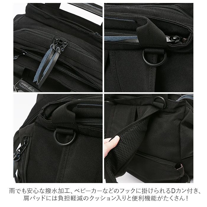 ・他にも、暗闇で目立つリフレクタータグ、雨でも安心な撥水加工、ベビーカーなどのフックに掛けられるDカン付き、肩パッドには負担軽減のクッション入りと便利機能がたくさん!