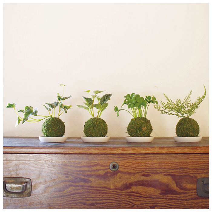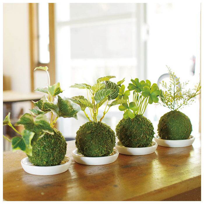 ・インテリアとして飾っておくだけで、消臭・防汚・抗菌の効果が期待できるお洒落なフェイクグリーンを、コロンと可愛らしい苔玉にアレンジ♪