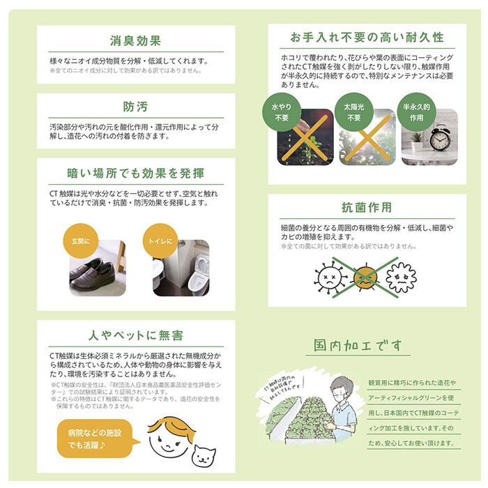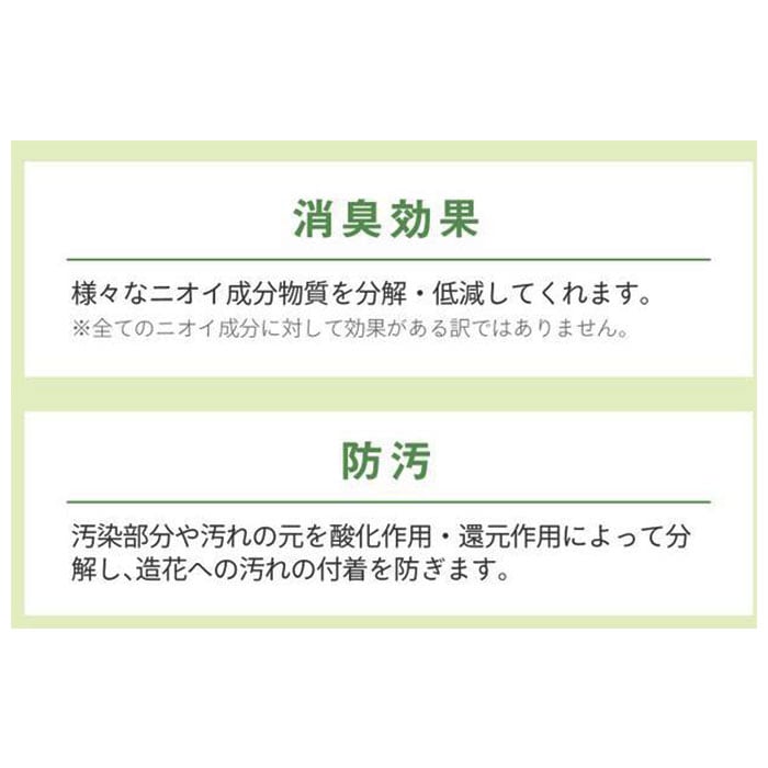 「WA BONSAI -和盆栽-」は、見た目の華やかさだけではなく「CT触媒加工」が施された、機能的なフェイクグリーン。お部屋の消臭効果はもちろん、その抗菌作用で細菌やカビの増殖を防止する効果も!