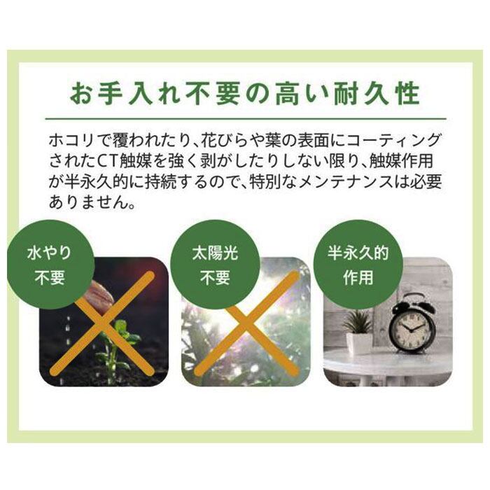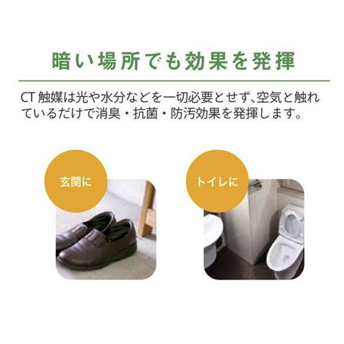 ・CT触媒は、ホコリに埋もれない限り半永久的に効果を発揮。光のない暗い場所でも効果が続くため、お手洗いや玄関にも置いてもOK!