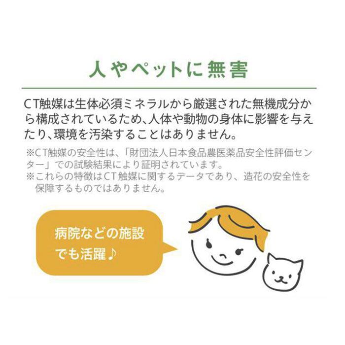 「CT触媒」とは、生体必須ミネラルに含まれる元素から厳選したミネラル複合体のこと。非常に安全性が高く、人体にも無害なので、小さなお子さまやペットのいるご家庭でも安心。
