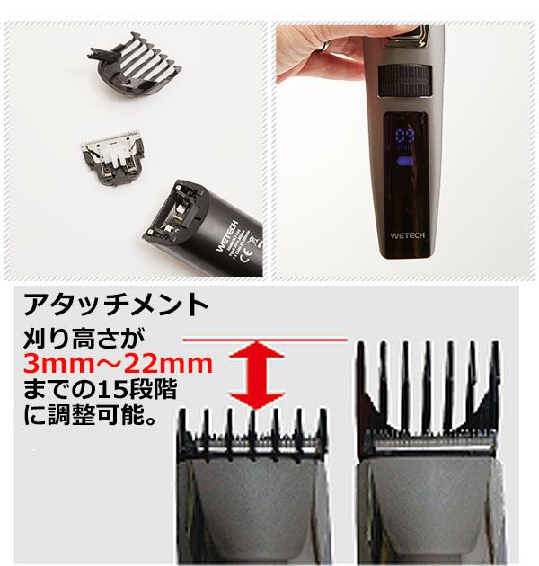 ●刈り高さ選択スイッチで3mm-22mmまで、1つのアタッチメントで15段階の刈り高さに調整できます。