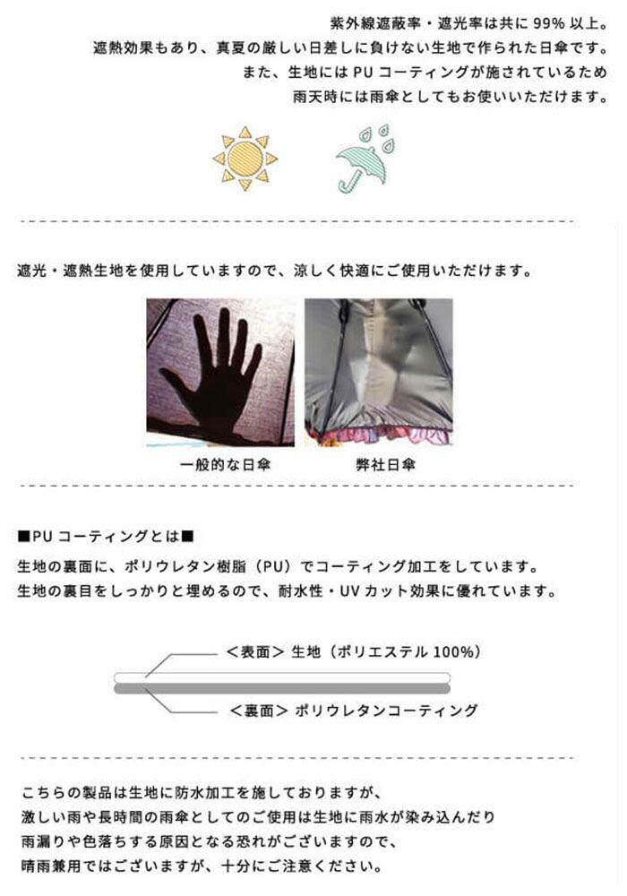 W.P.Cのおしゃれでかわいい日傘をの彩豊富にとりそろえました♪紫外線からお肌をれるようUVカット加工が施されています。紫外線遮蔽率は99%以上です。また太陽光を大幅カットする遮光率も99%(白色は97%)以上の日傘です!