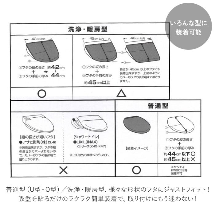 ・普通型(U型・O型)/洗浄・暖房型、様々な形状のフタにジャストフィット!吸盤を貼るだけのラクラク簡単装着で、取り付けにもう迷わない!