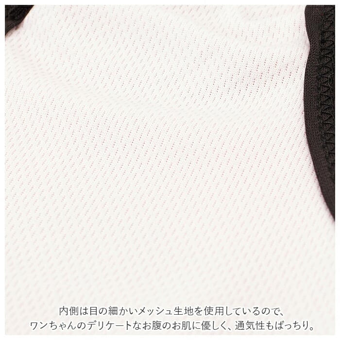 ・内側は目の細かいメッシュ生地を使用しているので、ワンちゃんのデリケートなお腹のお肌に優しく、通気性もばっちり。