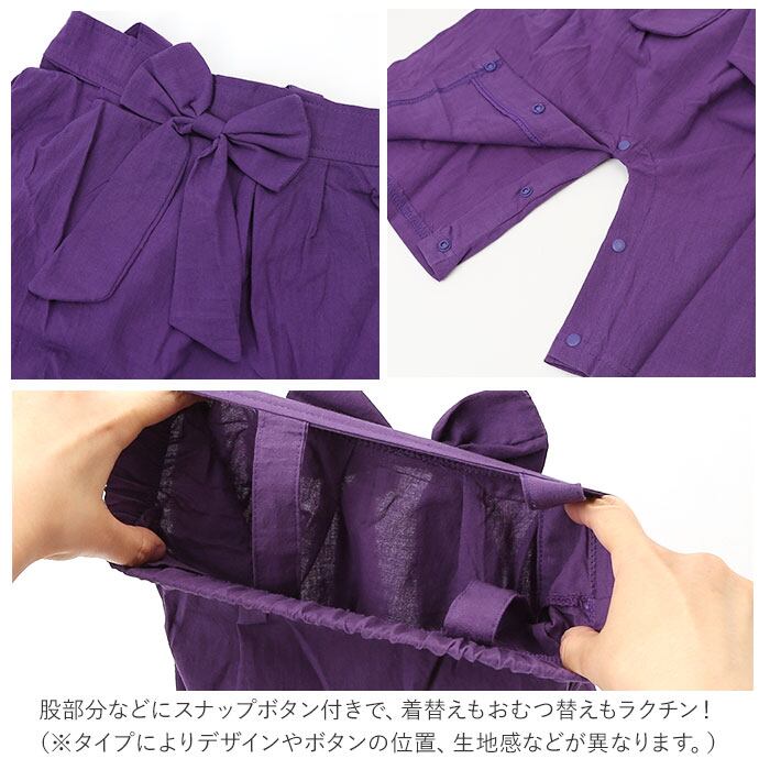 ・股部分などにスナップボタン付きで、着替えもおむつ替えもラクチン!(※タイプによりデザインやボタンの位置、生地感などが異なります。)