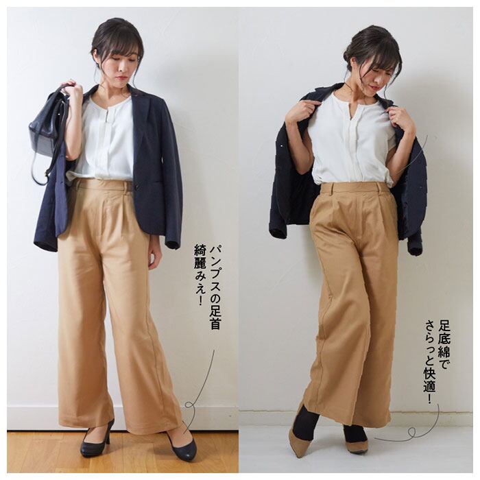 ・ストッキング部分は自然な素肌感に魅せるカラーで、パンツの裾からチラリと見える足元をキレイに演出。パンツスタイルで足元が冷える時の対策にもぴったり。