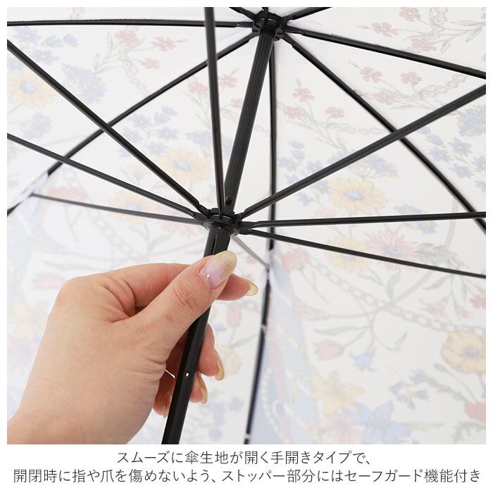 ・スムーズに傘生地が開く手開きタイプで、開閉時に指や爪を傷めないよう、ストッパー部分にはセーフガード機能付き。